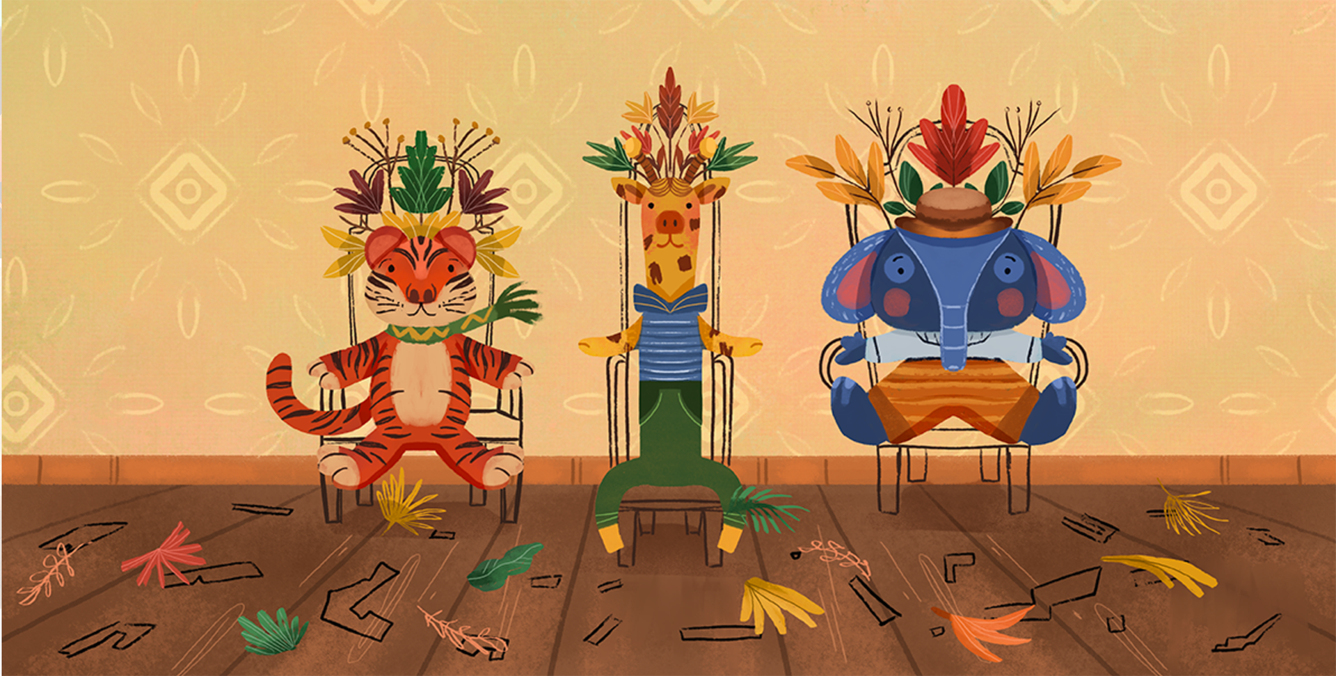 For this story about a wise king, I played with textured brushes and simple yet thoughtful compositions. The visual approach aimed to convey calmness and introspection, highlighting the character’s wisdom through expressive, handmade details.
